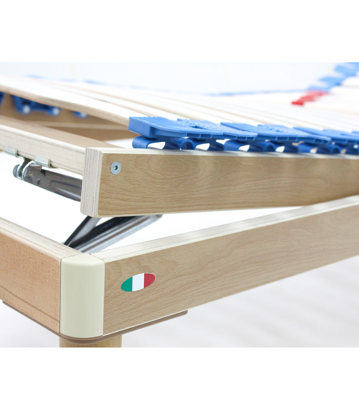 Nella versione matrimoniale, sono presenti 52 doghe (di cui 12 coppie di doppie doghe centrali), il longherone centrale da 36×70 mm ed il 5° piede, che garantiscono il massimo della robustezza e resistenza.